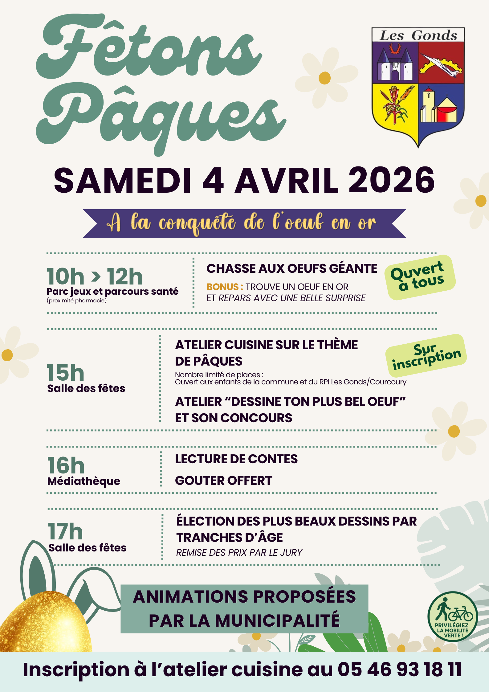 Samedi 4 avril 2026 animations Pâques ouvert à tous Programme de la journée: Chasse aux œufs de 10h00 - 12h00 Atelier cuisine de 15h00 - 17h00 (sur inscription à l'accueil de la mairie 05.46.93.18.11) Atelier dessin et son concours de 15h00- 17h00 Lecture de contes de 16h00-17h00